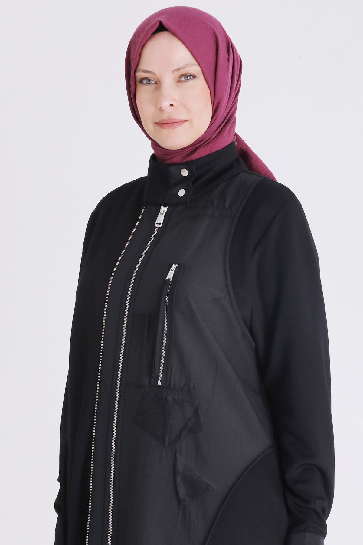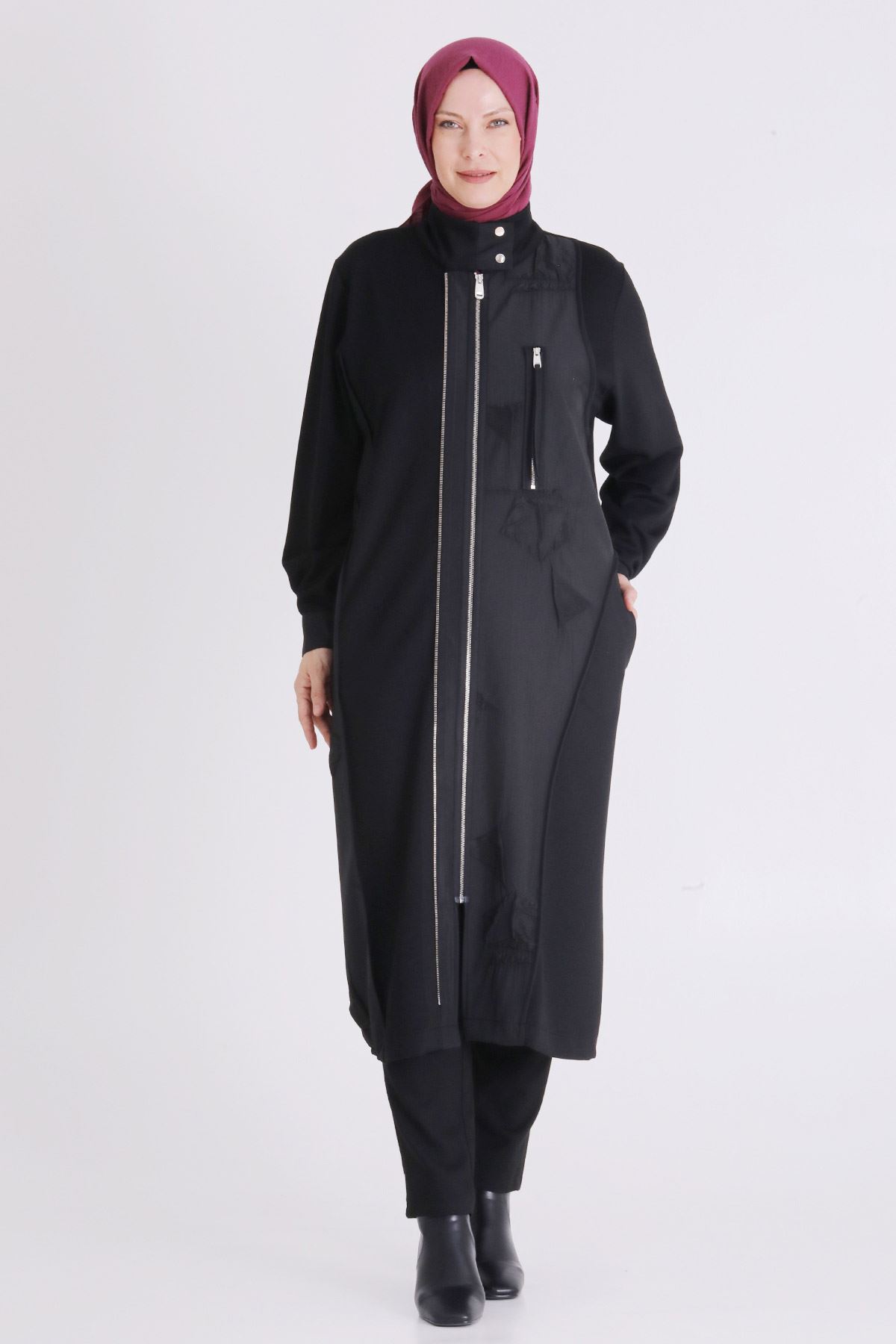 Ürün Detayları: Önden fermuarlı jakar kumaş kombinli ürünümüz dik yaka ve ceplidir.