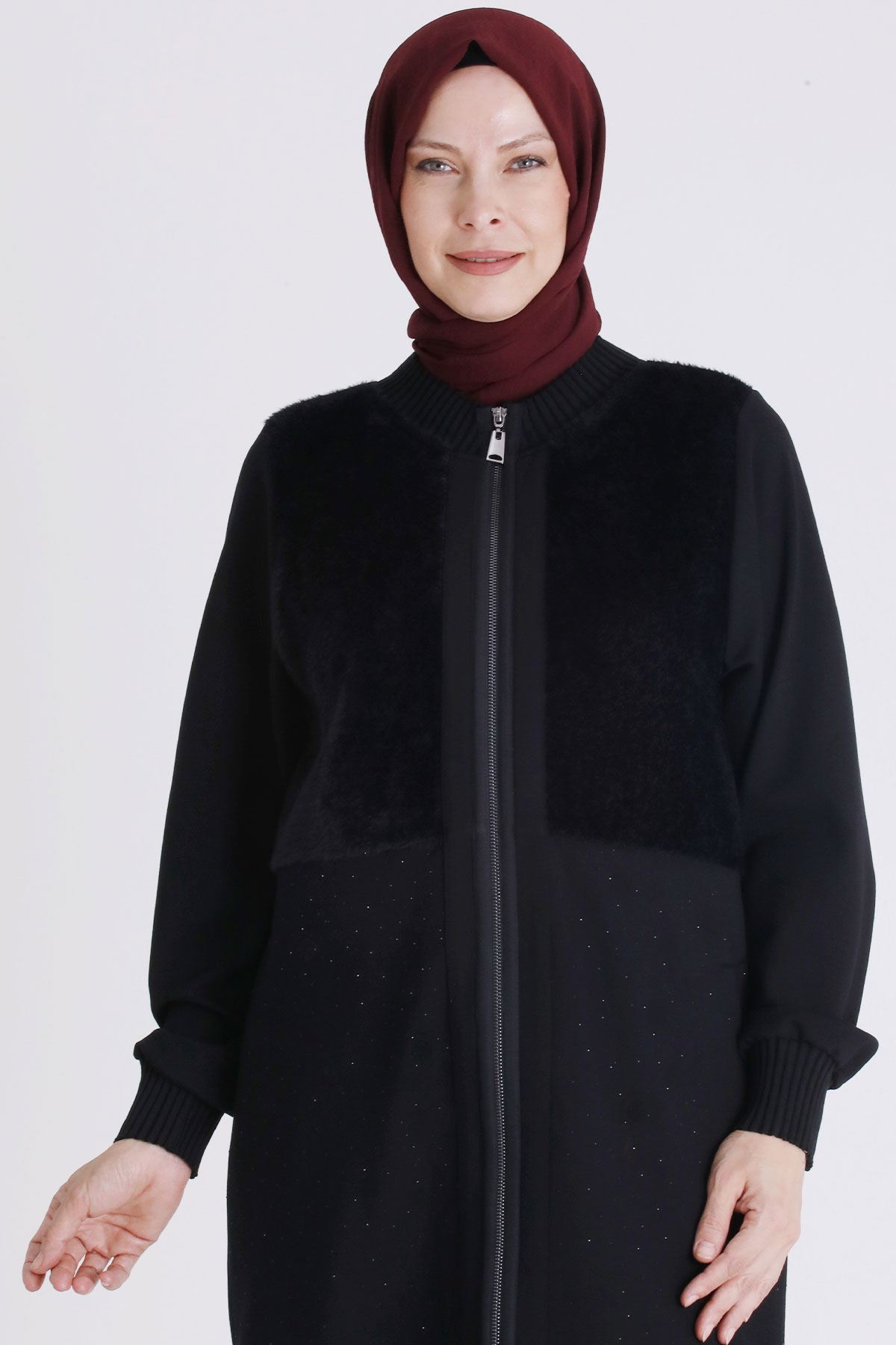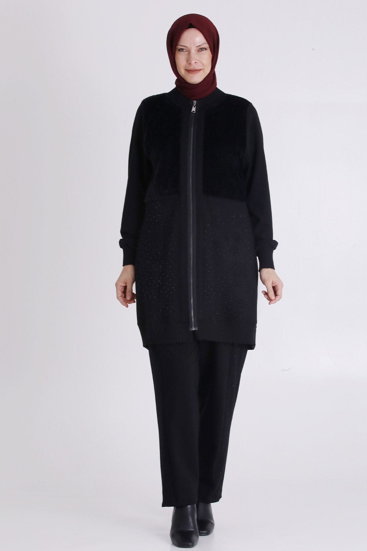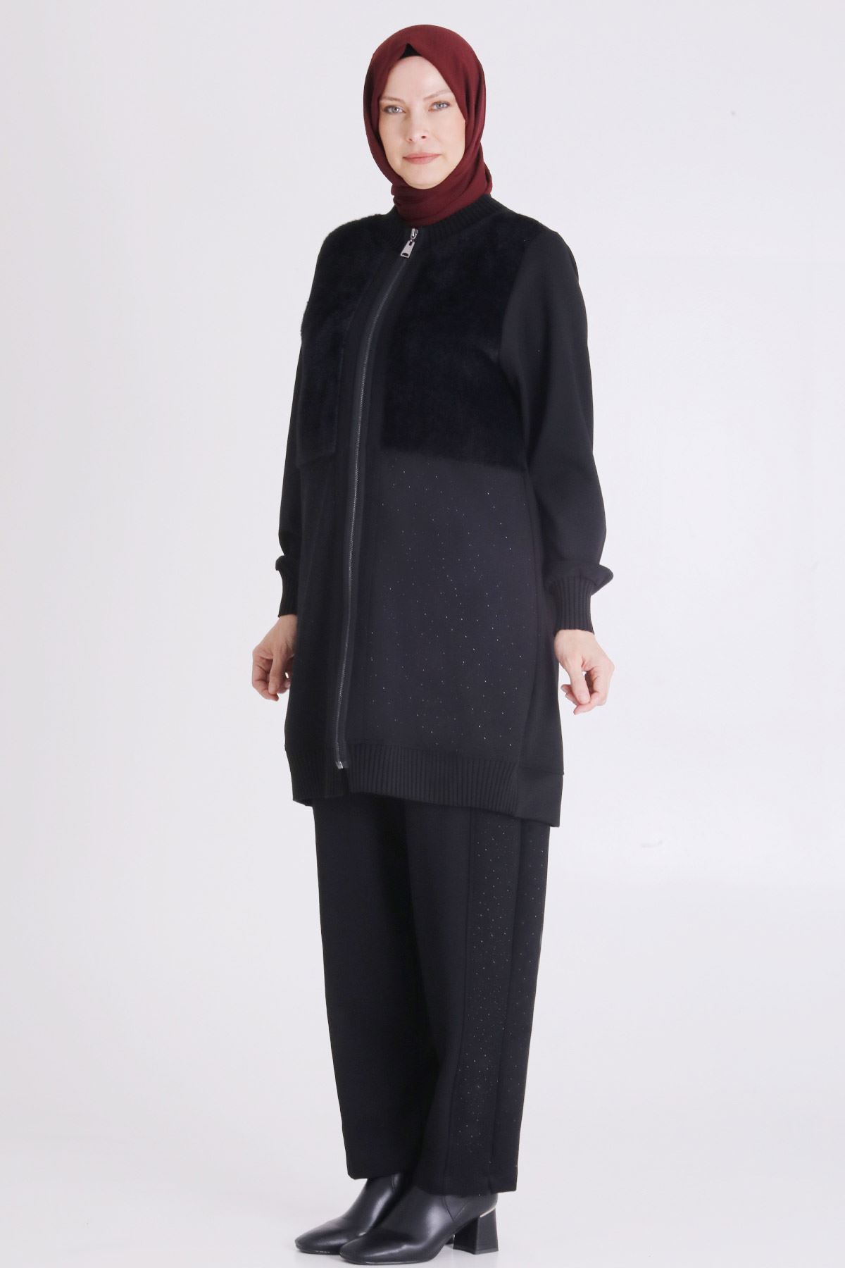 Ürün Detayları: Kürk kombinli ürünümüz önden fermuarlıdır, yaka kol ve etek ucu örme manşetlidir hotfix taş detaylıdır. Pantolon beli lastiklidir.