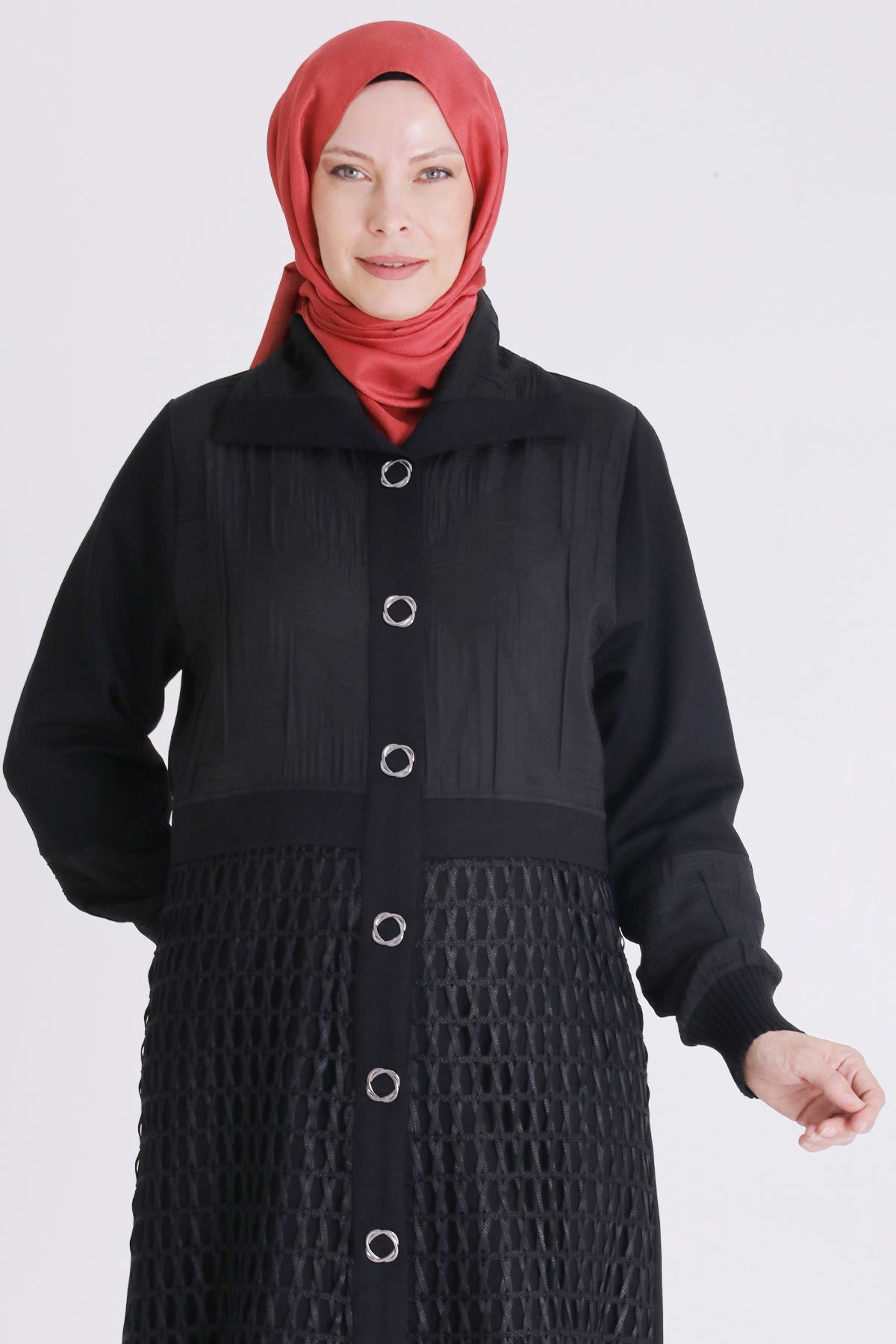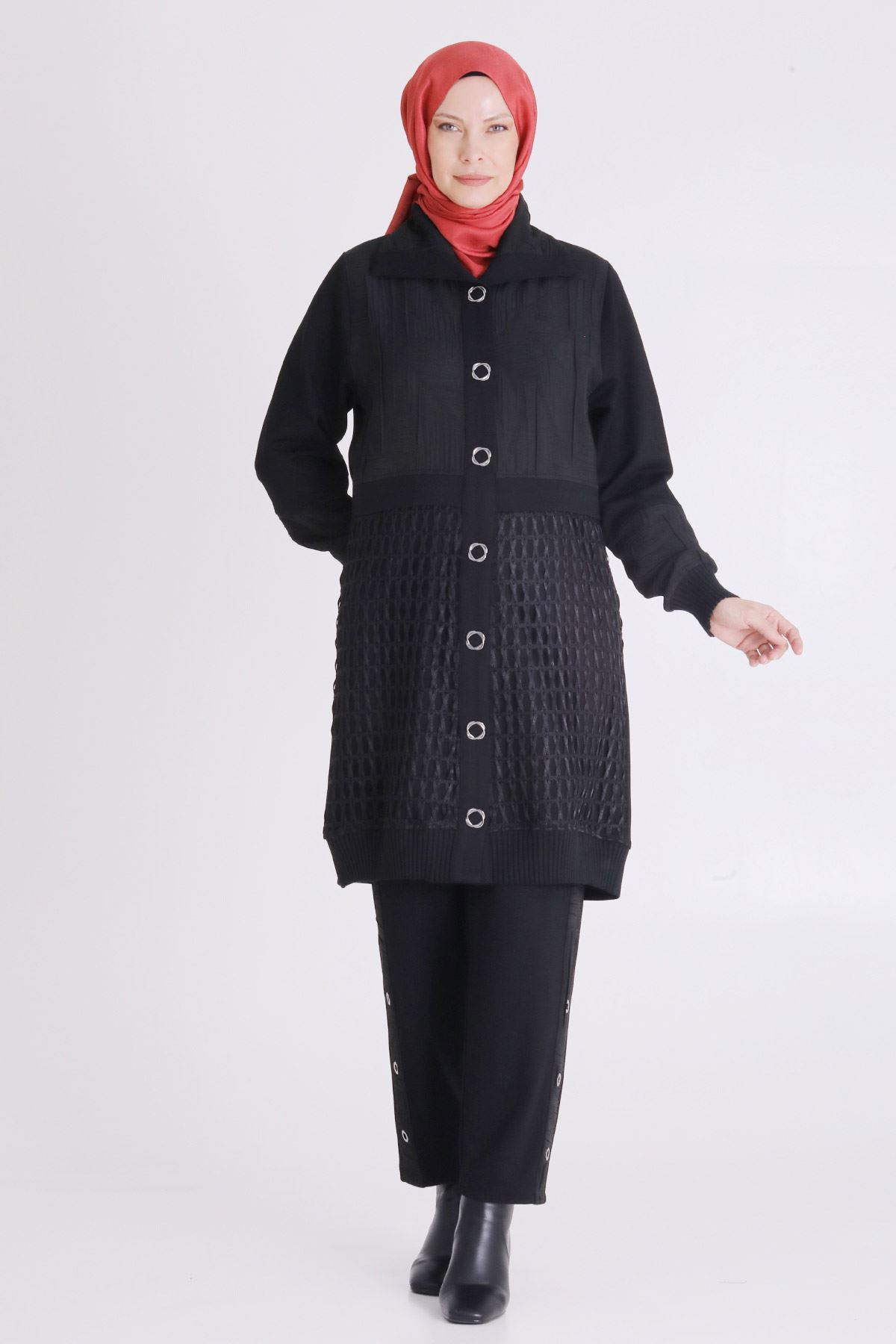 Ürün Detayları: File ve jakar kumaş kombinli ürünümüz çıtçıtlıdır. Etek ve kol ucu örme manşetlidir.Pantolon beli lastikli ve iki yandan ceplidir.