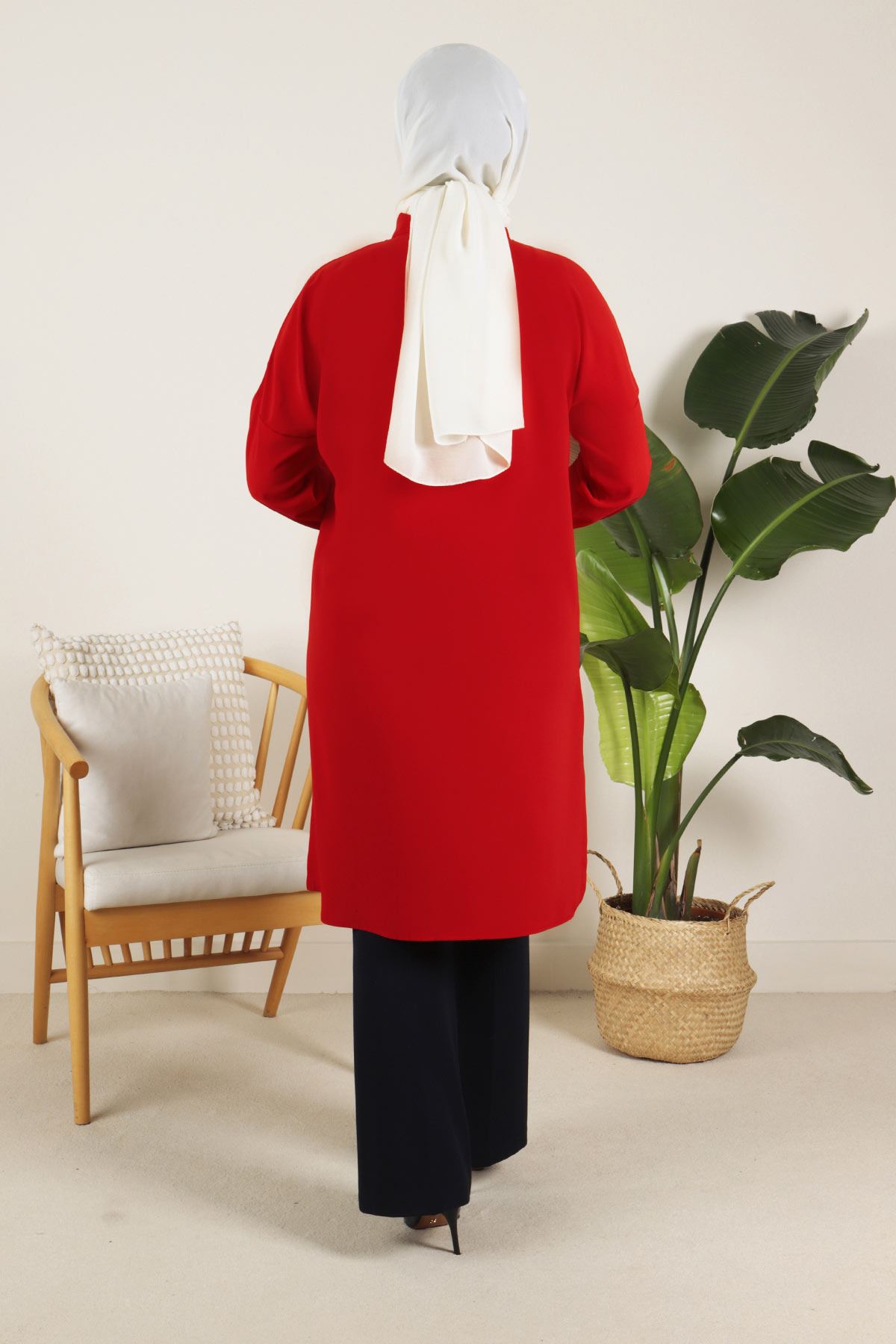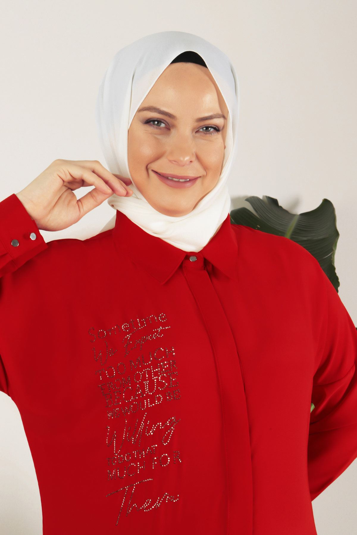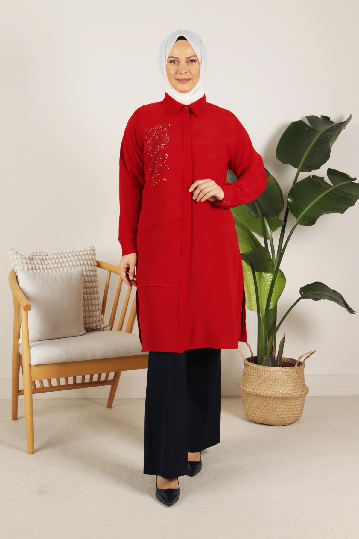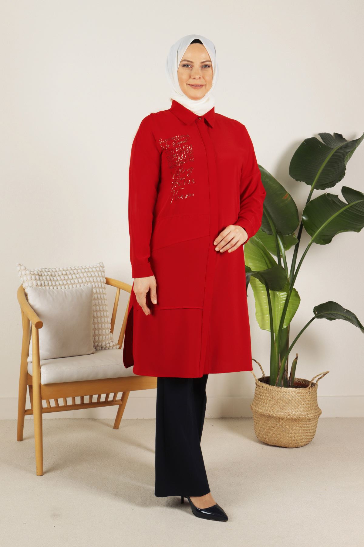 Büyük Beden Tesettür Taşlı Tunik 23017 Kırmızı
